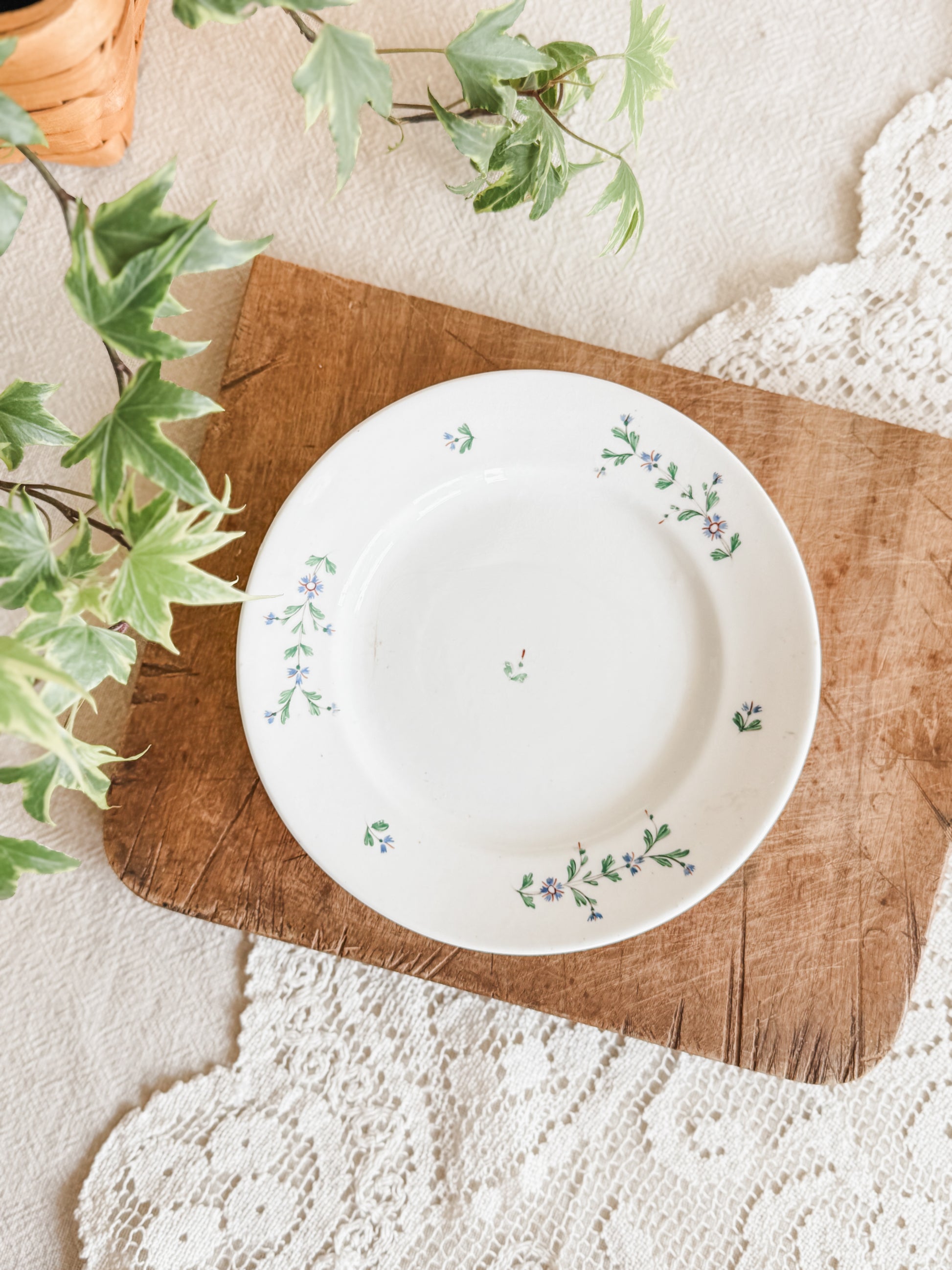Rare dessert sized antique French plates. Likely date to 1820-1830. Each plate has hand painted blue cornflowers. Varying degrees of wear on the center flower. There’s some staining and light crazing present.