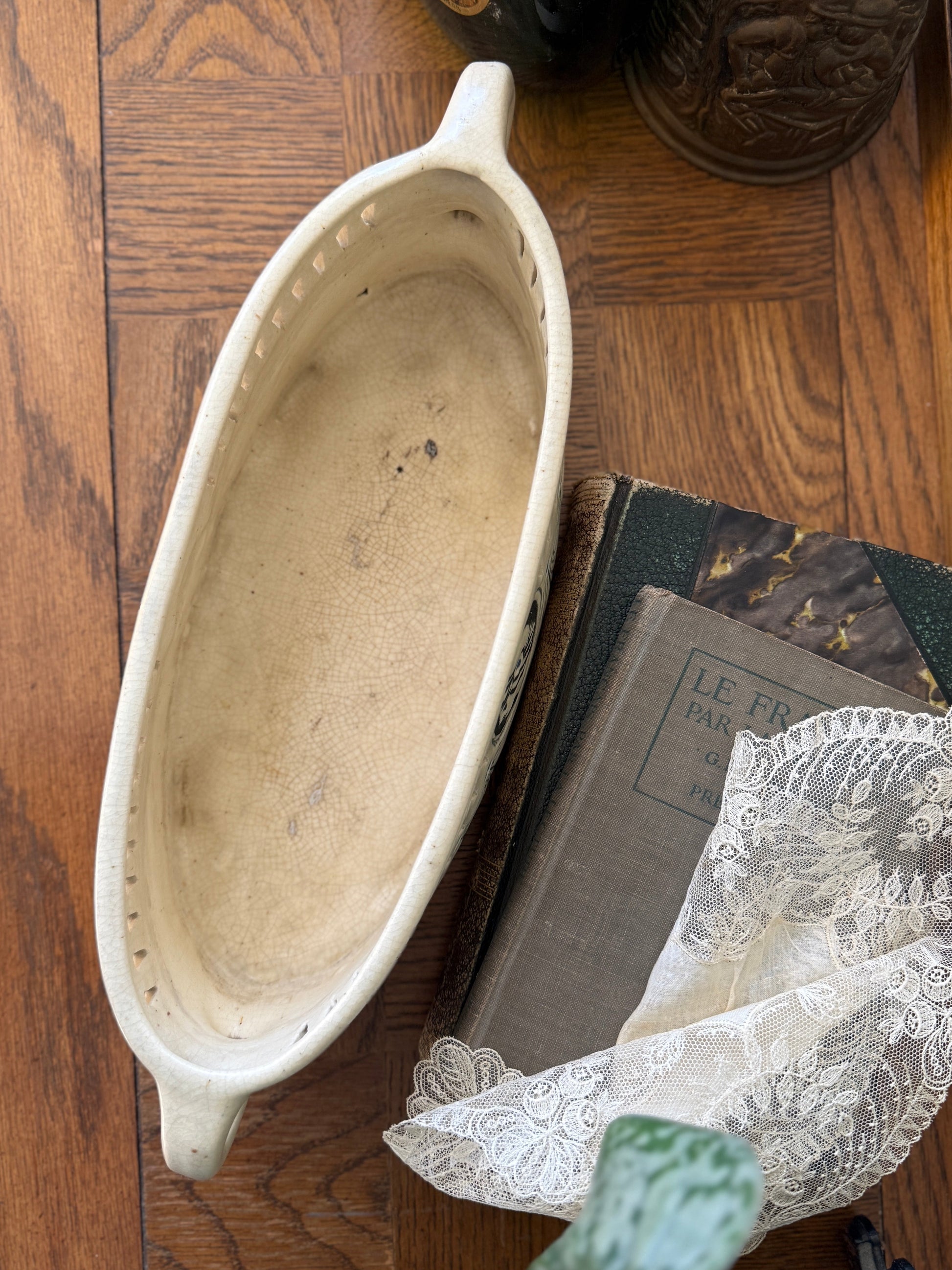 Antique art nouveau design featuring a cameo and a pierced motif along the rim. Staining and crazing throughout.