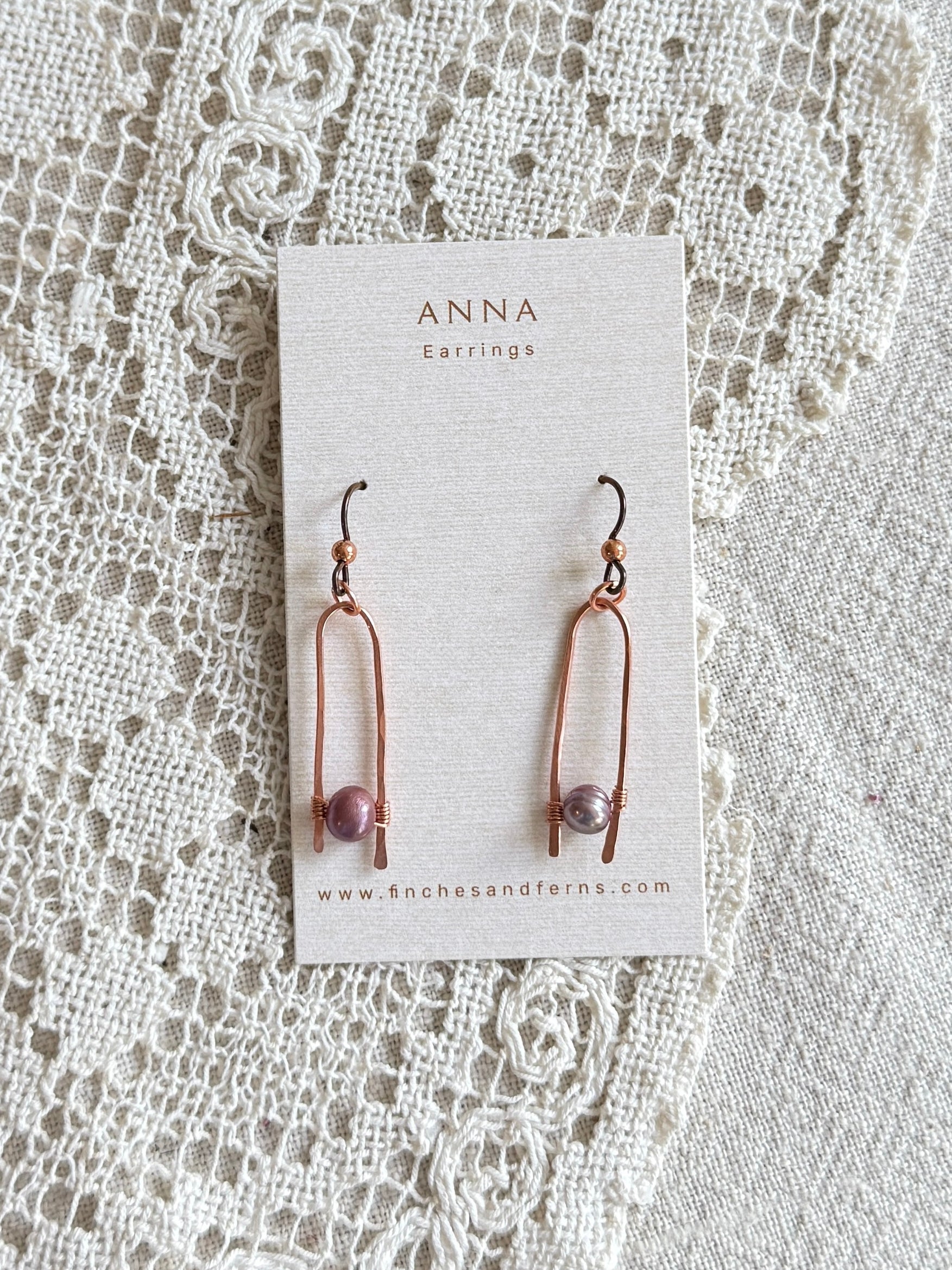 This pair of copper earrings features a long horseshoe drop design with a purple fresh water cultured pearl. The earring wire is hypo allergenic niobium ear wire.