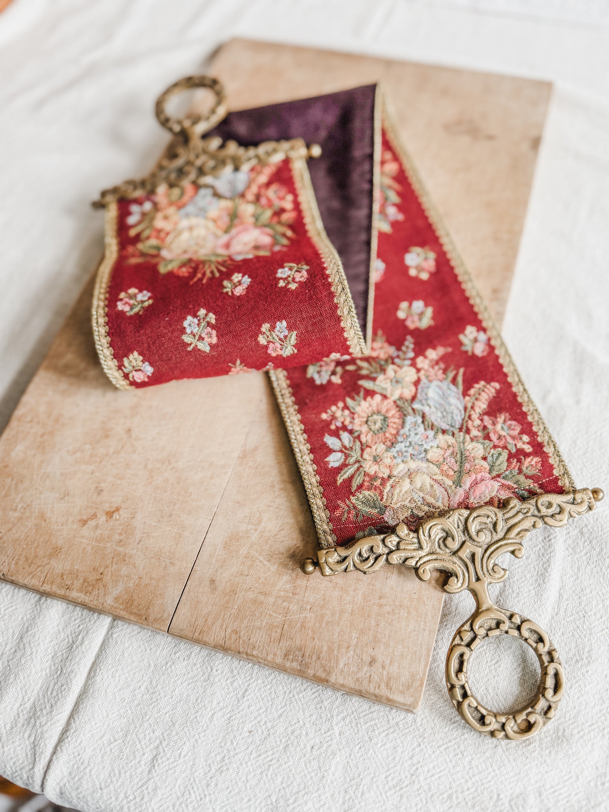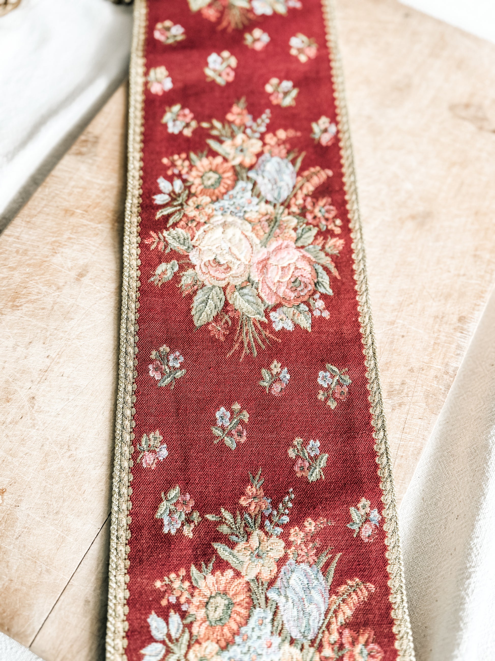 This beautiful floral bell pull will add so much elegance to any space. Features a maroon background with lighter colored florals, gold edgings and brass at either end.