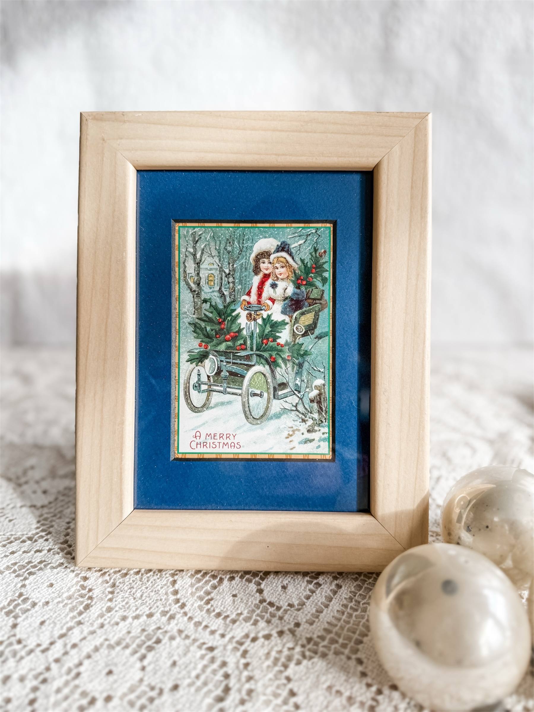 Christmas card featuring two girls riding an automobile framed in a dark blue mat. The frame is a light wood.