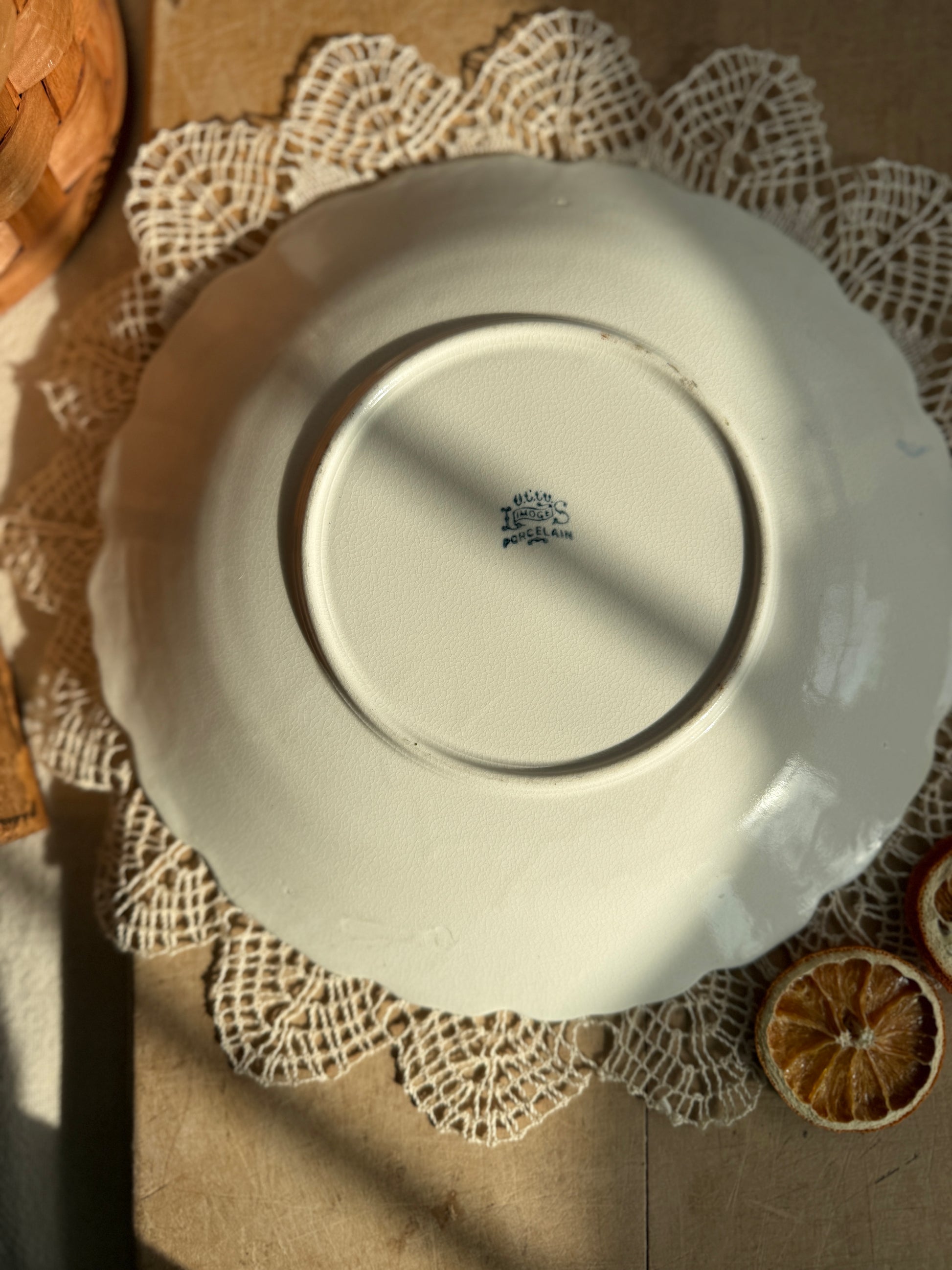 Add some color and charm to your kitchen or plate gallery wall with this French fruit plate. Handpainted oranges are surrounded by a bright and cheery blue border. Marked Limoges on the back. Crazing present.