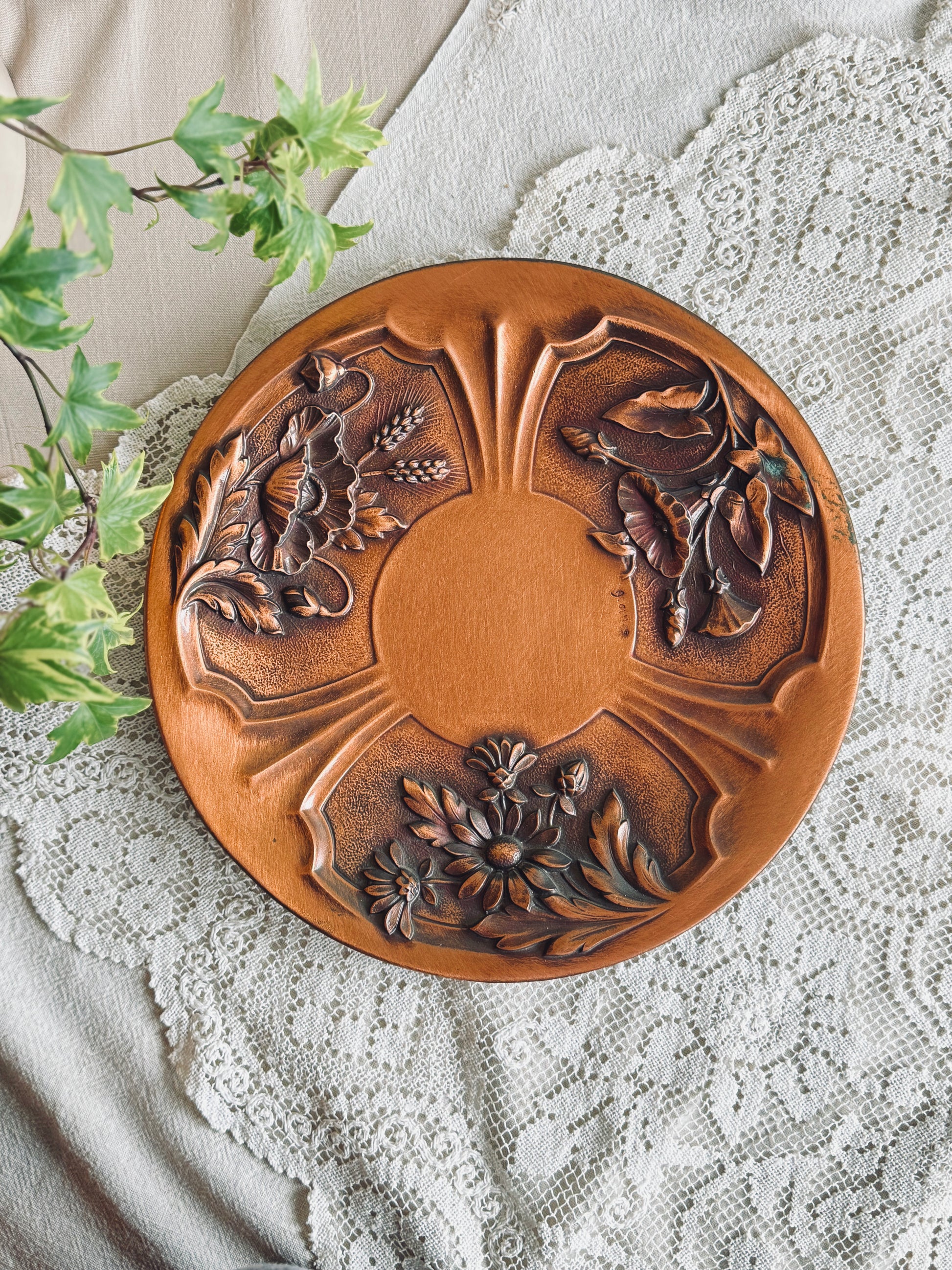 This large copper wall plate has embossed florals around the edge. The back has a flocked velvet material and a hook for hanging.
