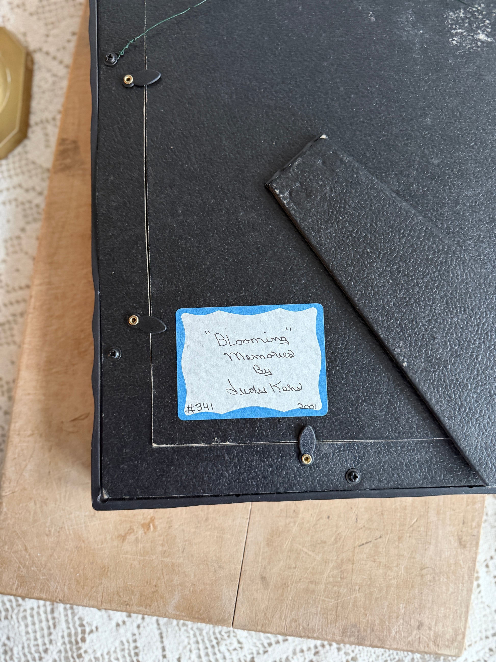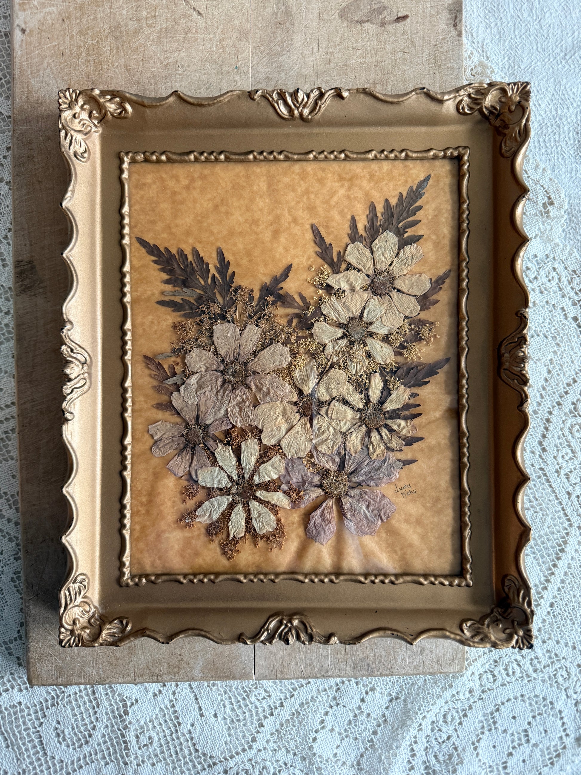 Dried floral arrangement against a golden background. Signed by the artist with a sticker on the reverse.