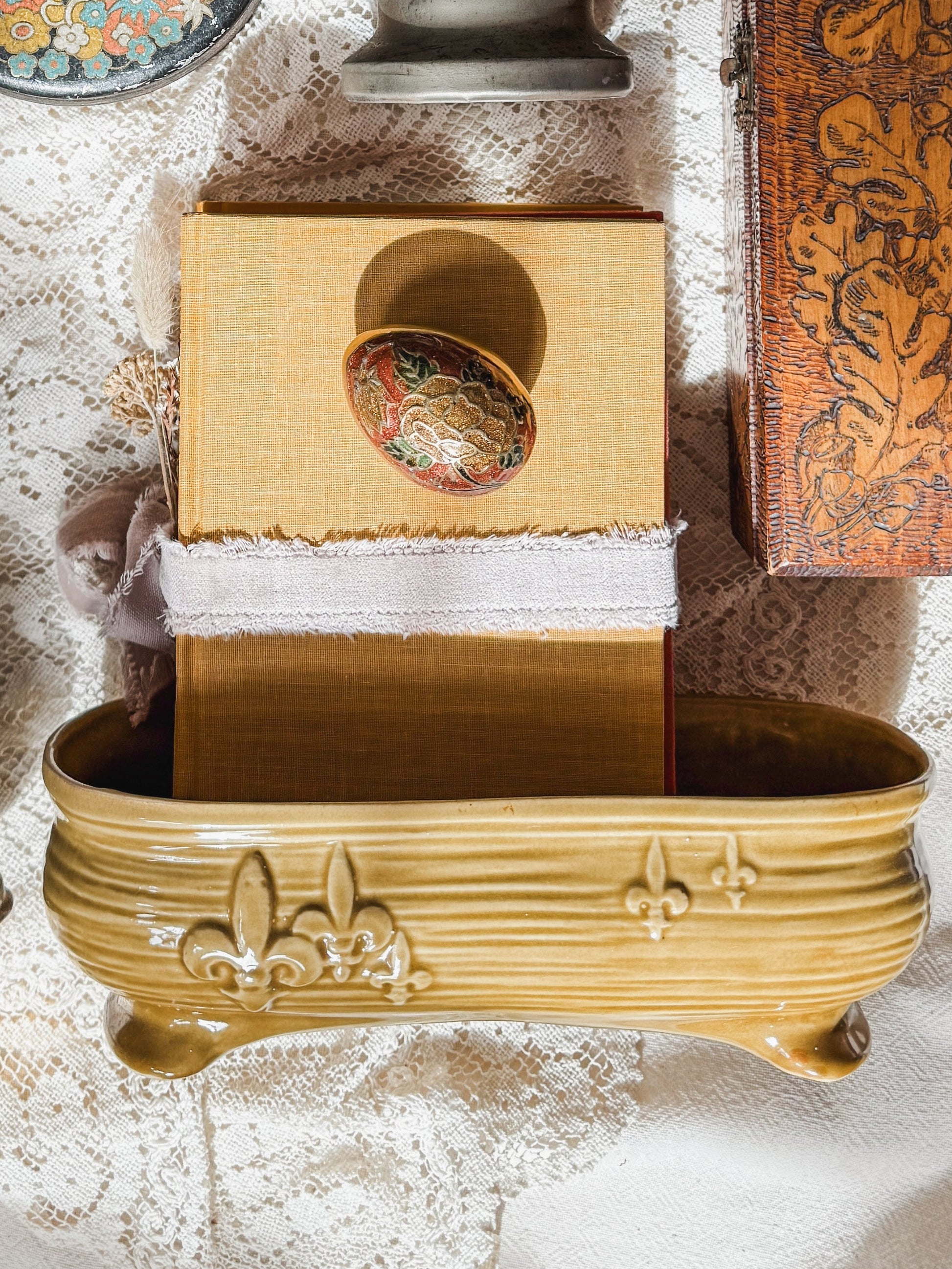 Oval shaped Mid century pottery planter. Beautiful gold color featuring fleur de lis.