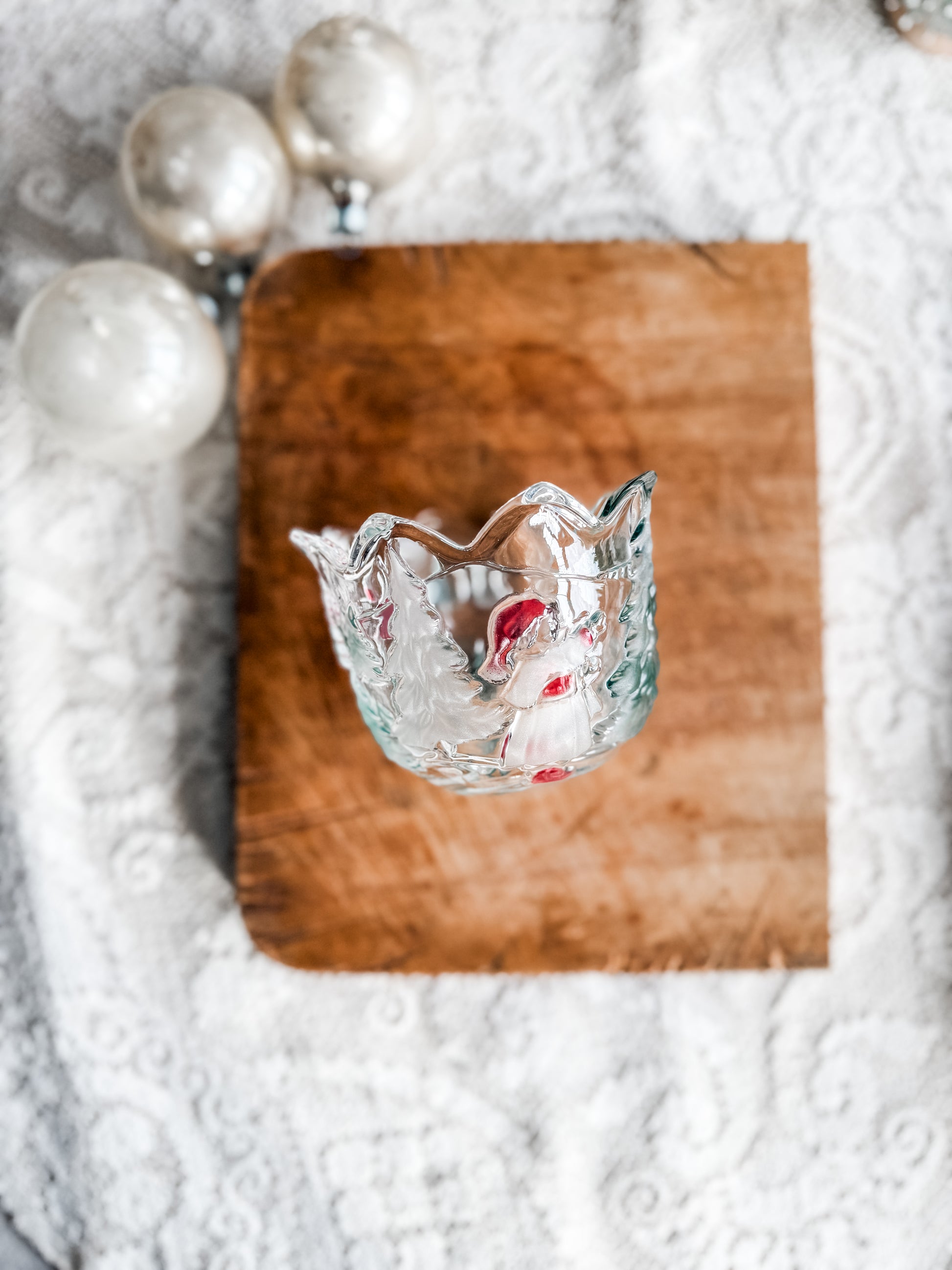 Add some holiday cheer to your home with this vintage frosted and colored glass tea light holder. It features beautiful winter scene. Heavy glass in pristine condition.