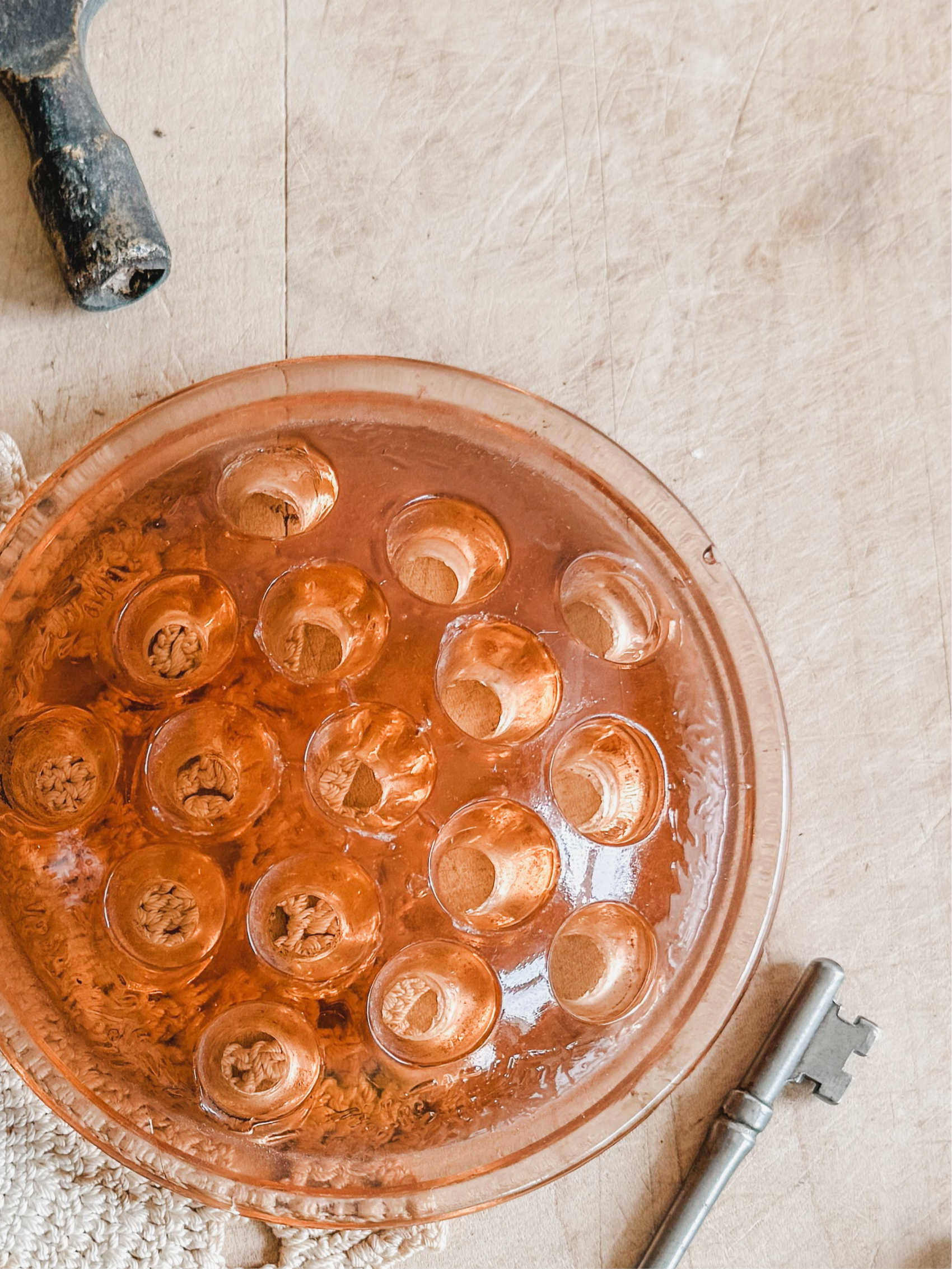 Although this is a pink depression glass flower frog, it gives off the loveliest peachy shade. Flower frogs are perfect for staging! I’ve put an old clock key into this one, but you can also use them to for their intended purpose on top of a vase for fresh cut flowers.