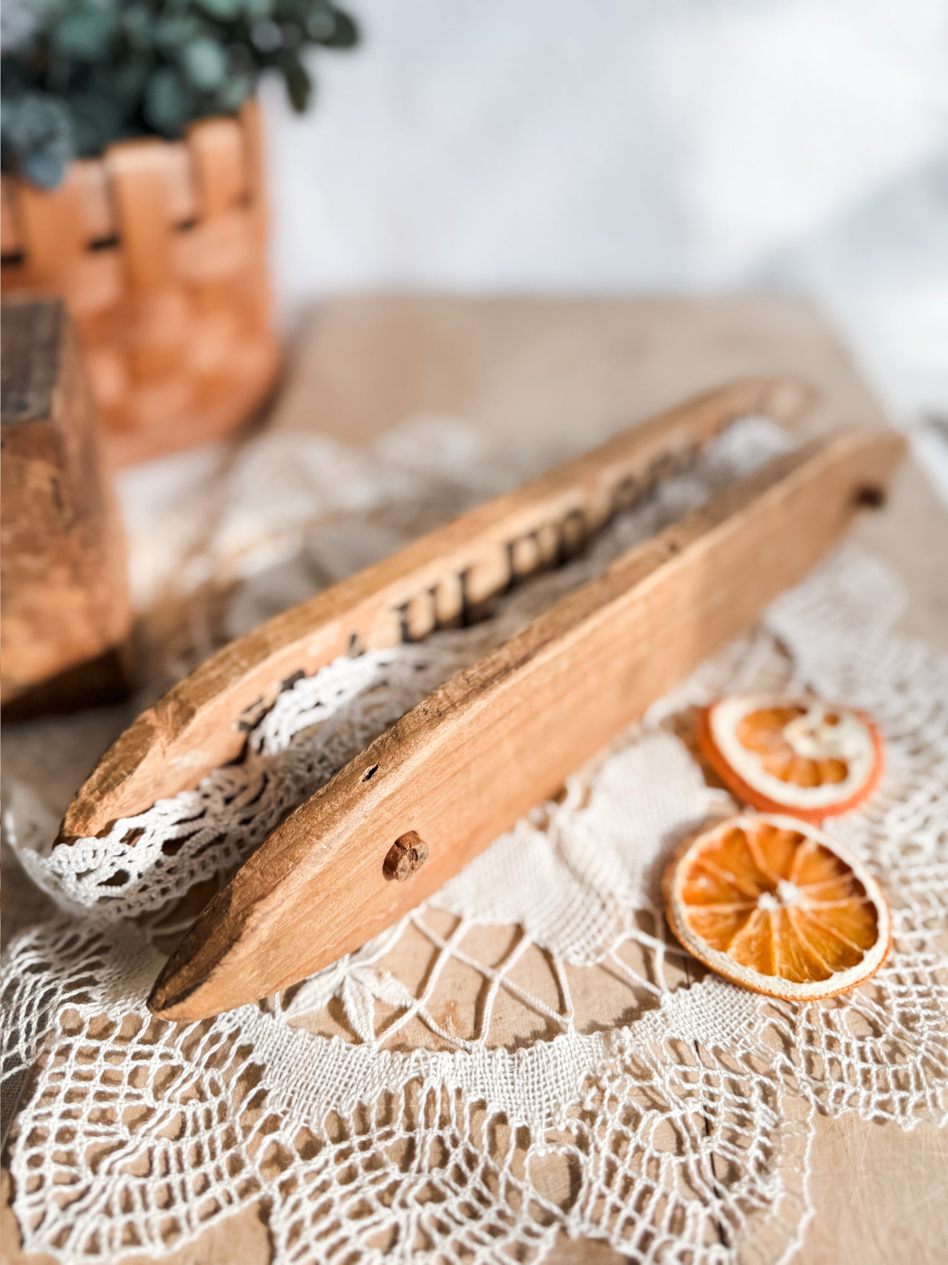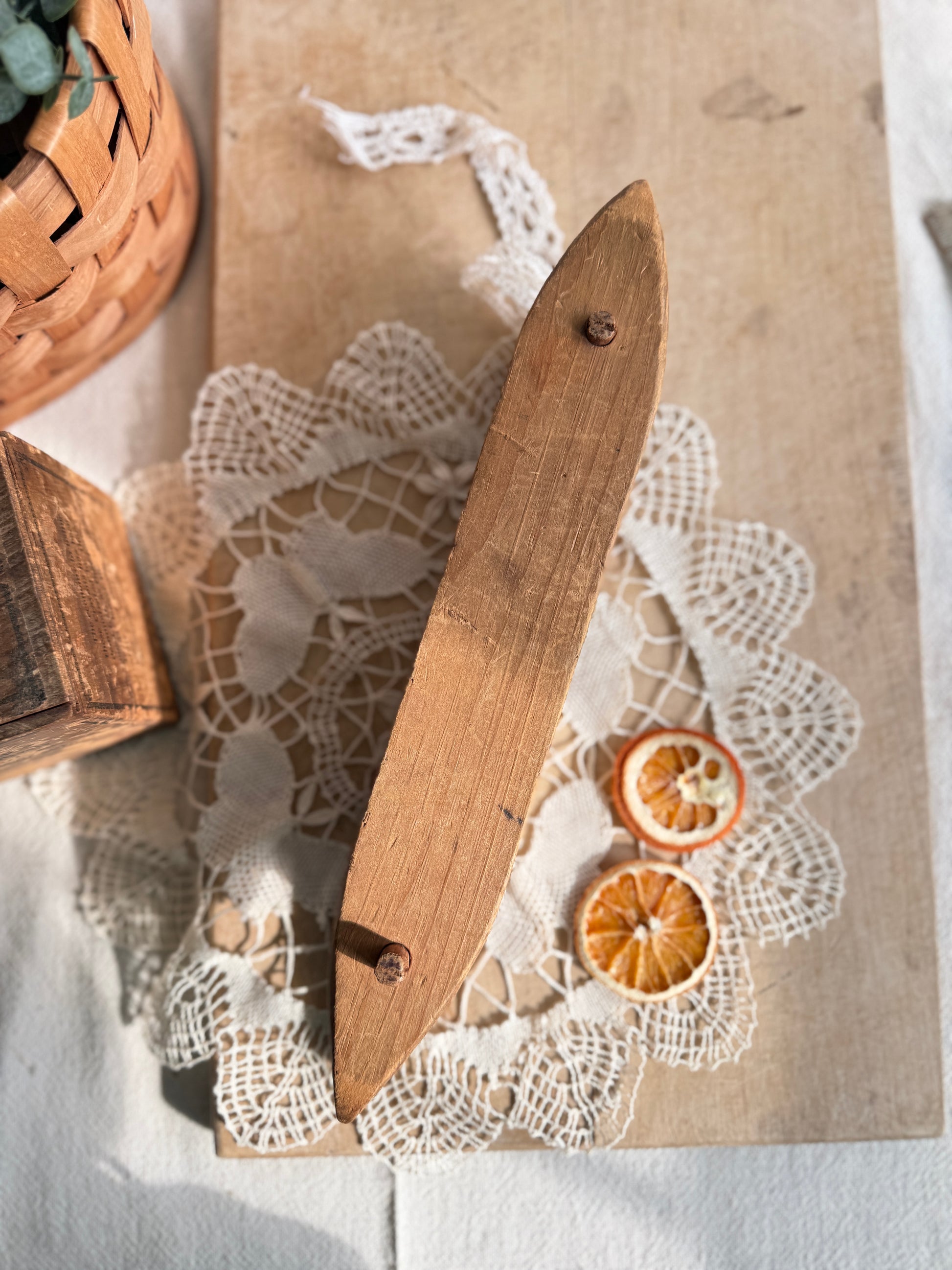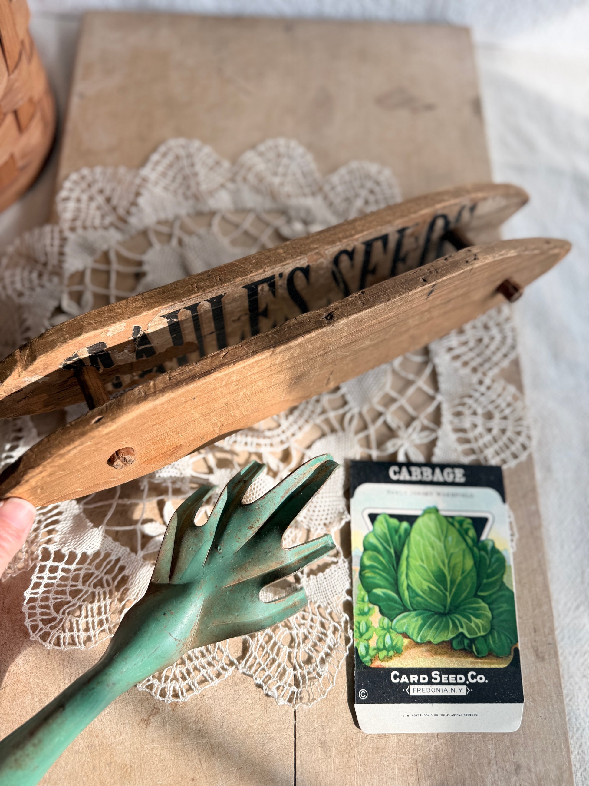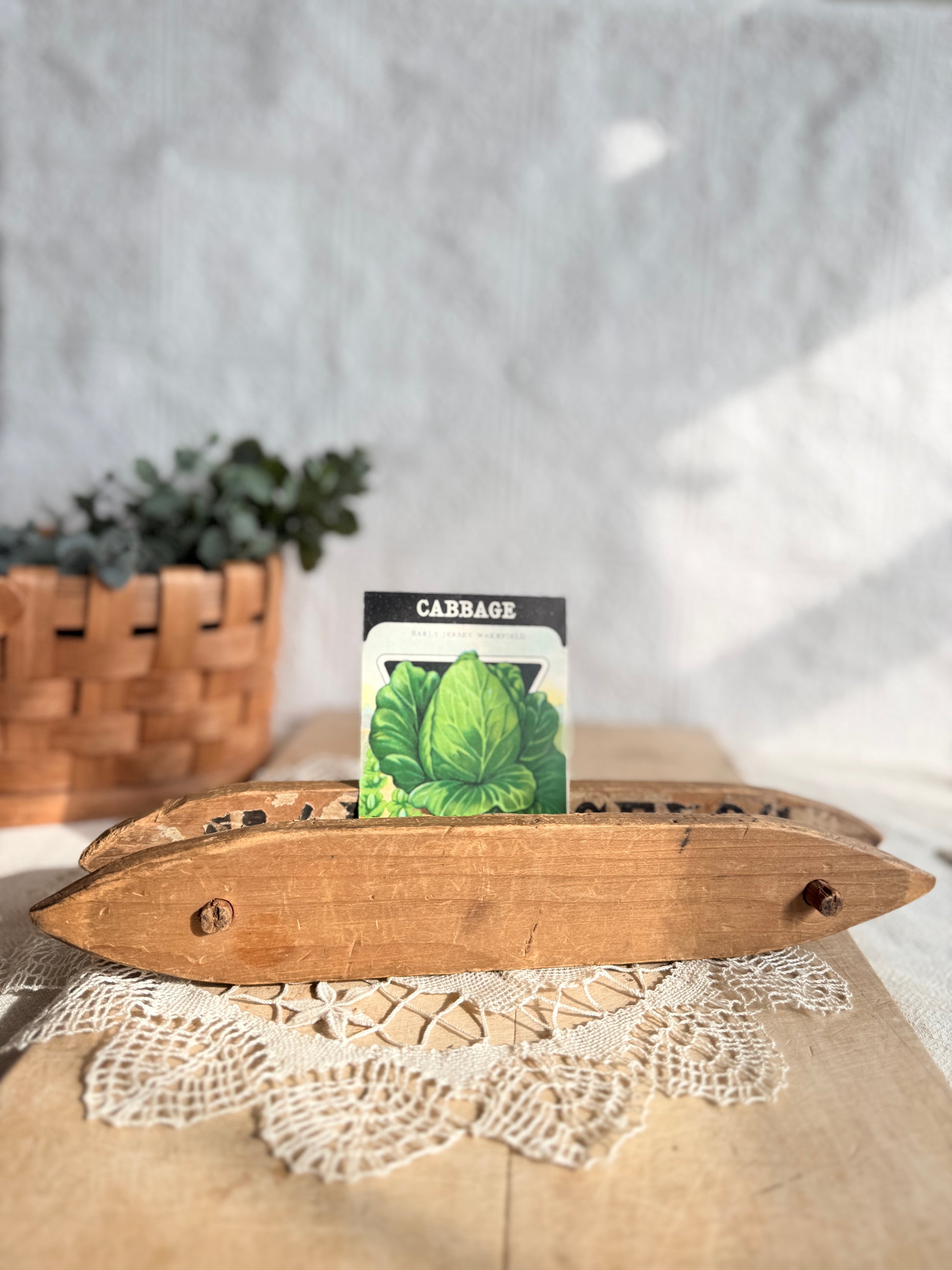 This piece was handmade from an antique seed advertising box. You can see a glimpse of the remains of the paper on the inside. The piece has been joined with dowels. You can lovingly display your favorite ribbon on it or prop decor inside it.