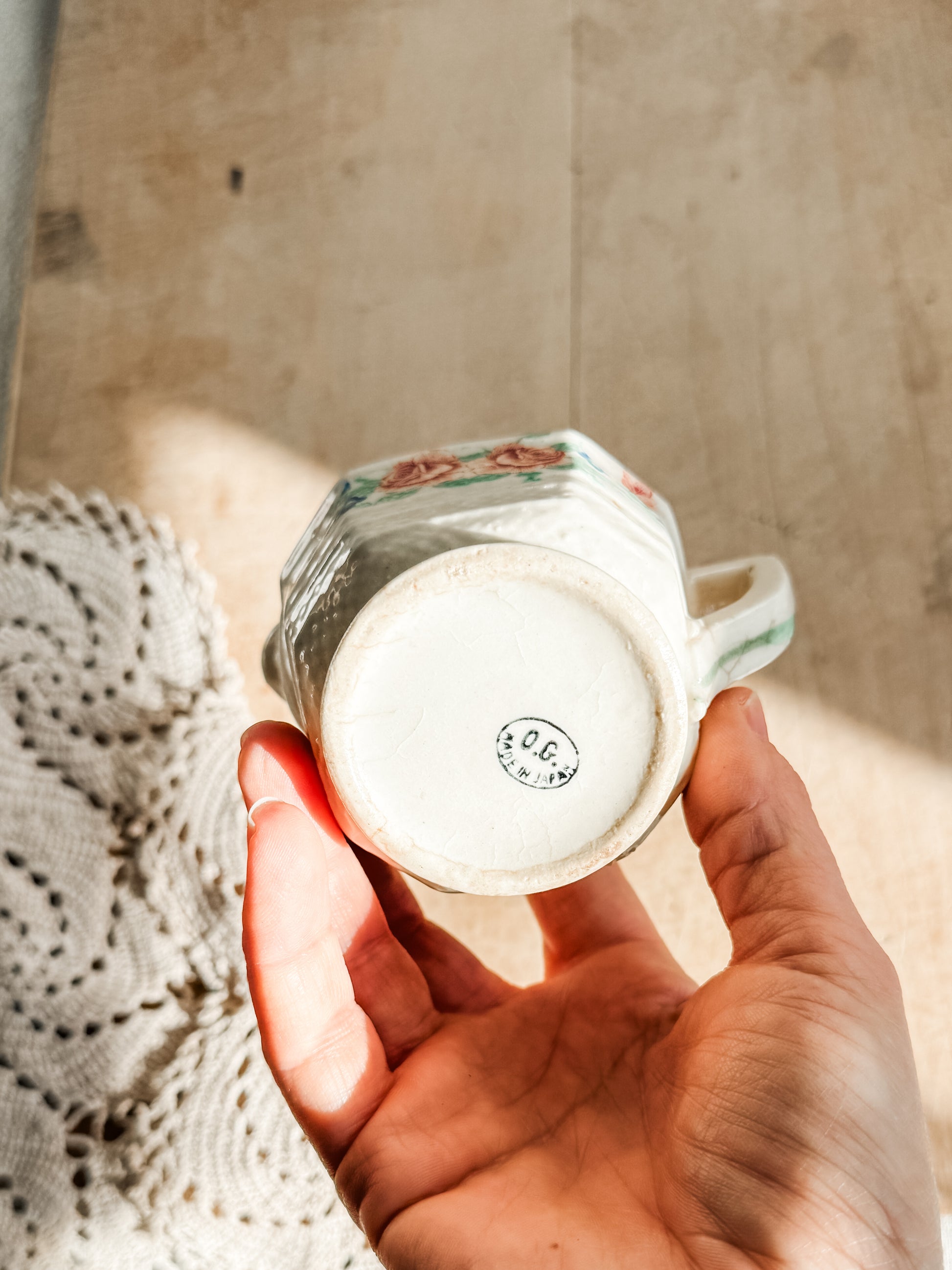 This sweet little creams features colorful florals and a bright green border. Some staining and crazing present.
