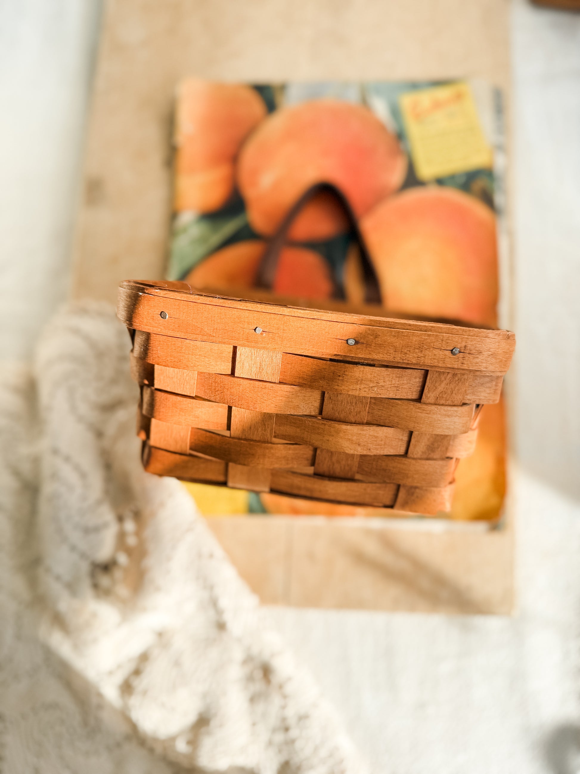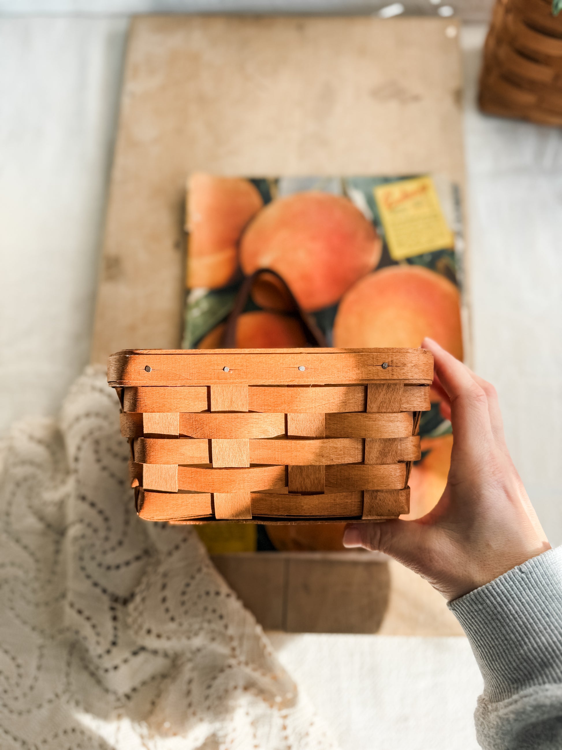 Small vintage Longaberger woven basket with leather handle and wall hanger