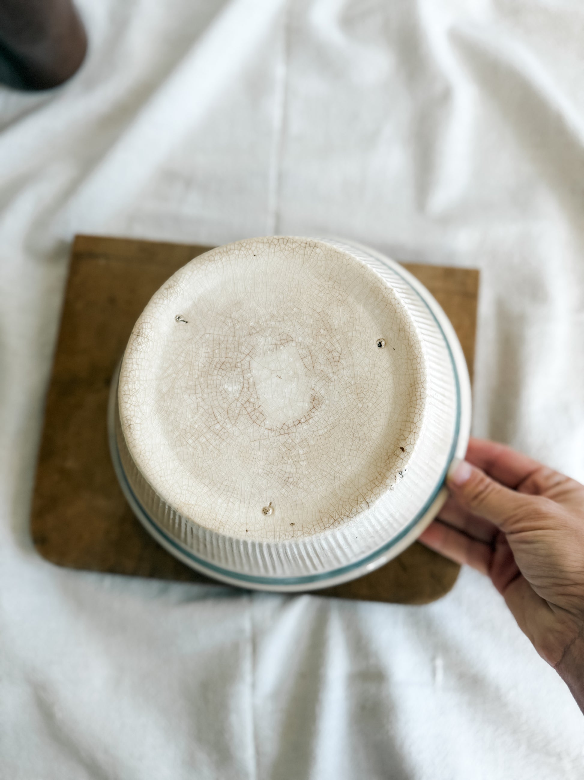 Stained and crazed antique serving bowl with teal stripe.