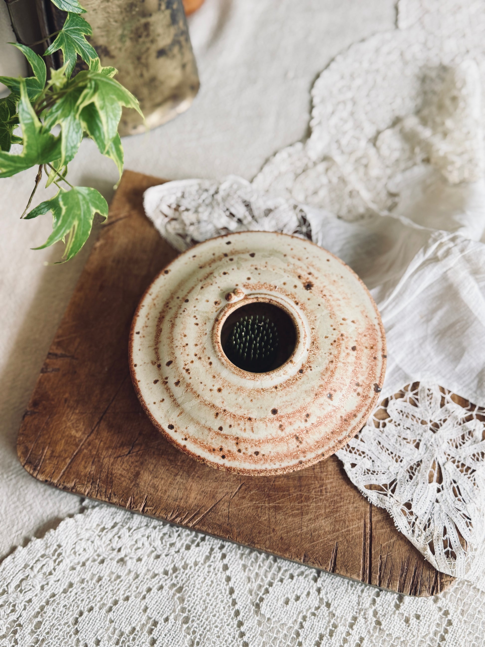 Studio pottery flower frog for the Japanese art of Ikebana. Stamped with the artist’s symbol and presumably the year 2008. Spruce up any space with fresh florals in this flower frog. To use, add some water until just covering the top of the spikes. Push down any flower stems into the spikes.