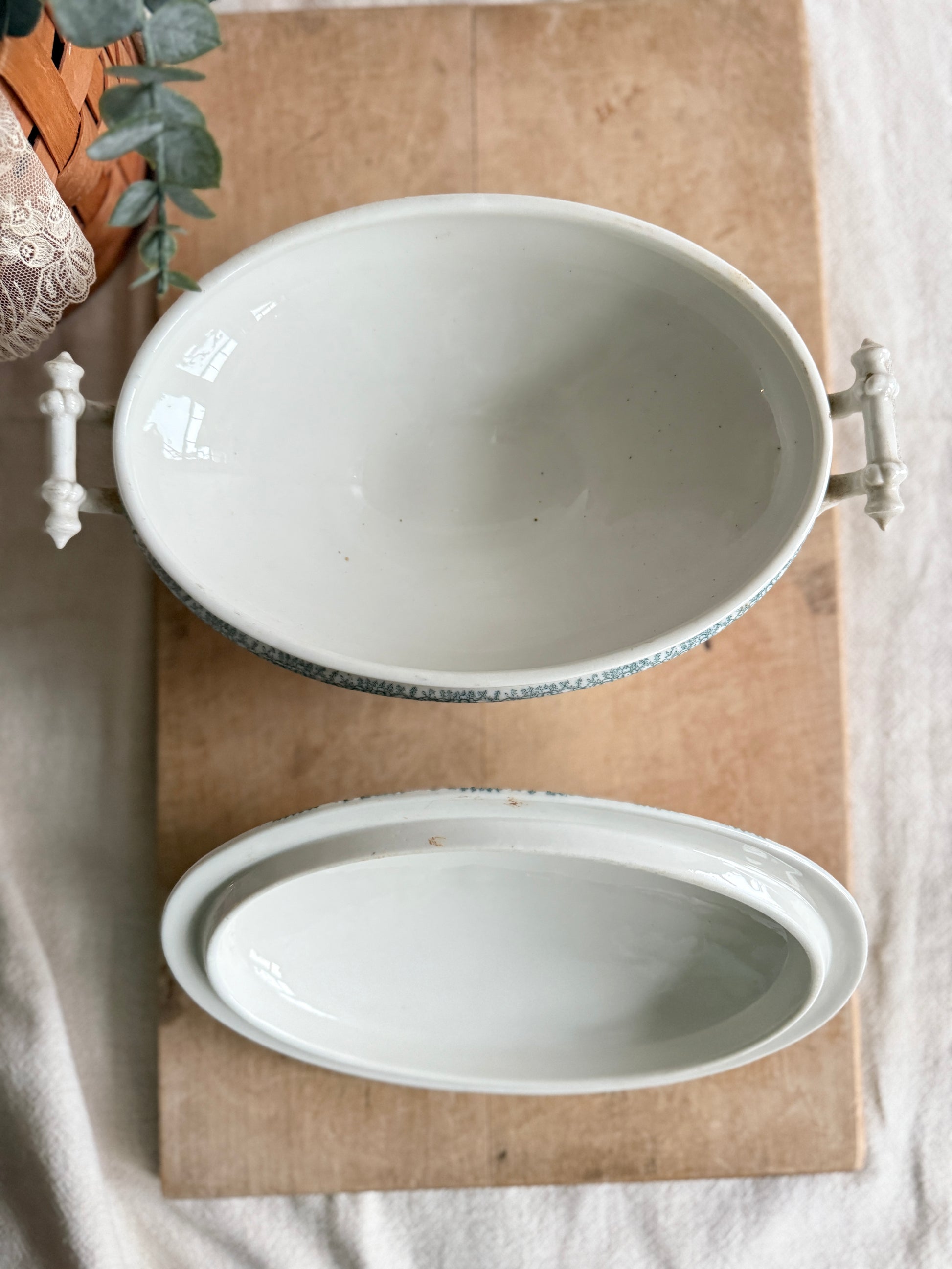 This antique footed tureen is a special find. Often hotels, shops and restaurants had tureens with the name of the establishment. Much research was given to finding the origin of this piece but to no avail. The piece was found in Maryland but I can’t be certain it was from there.