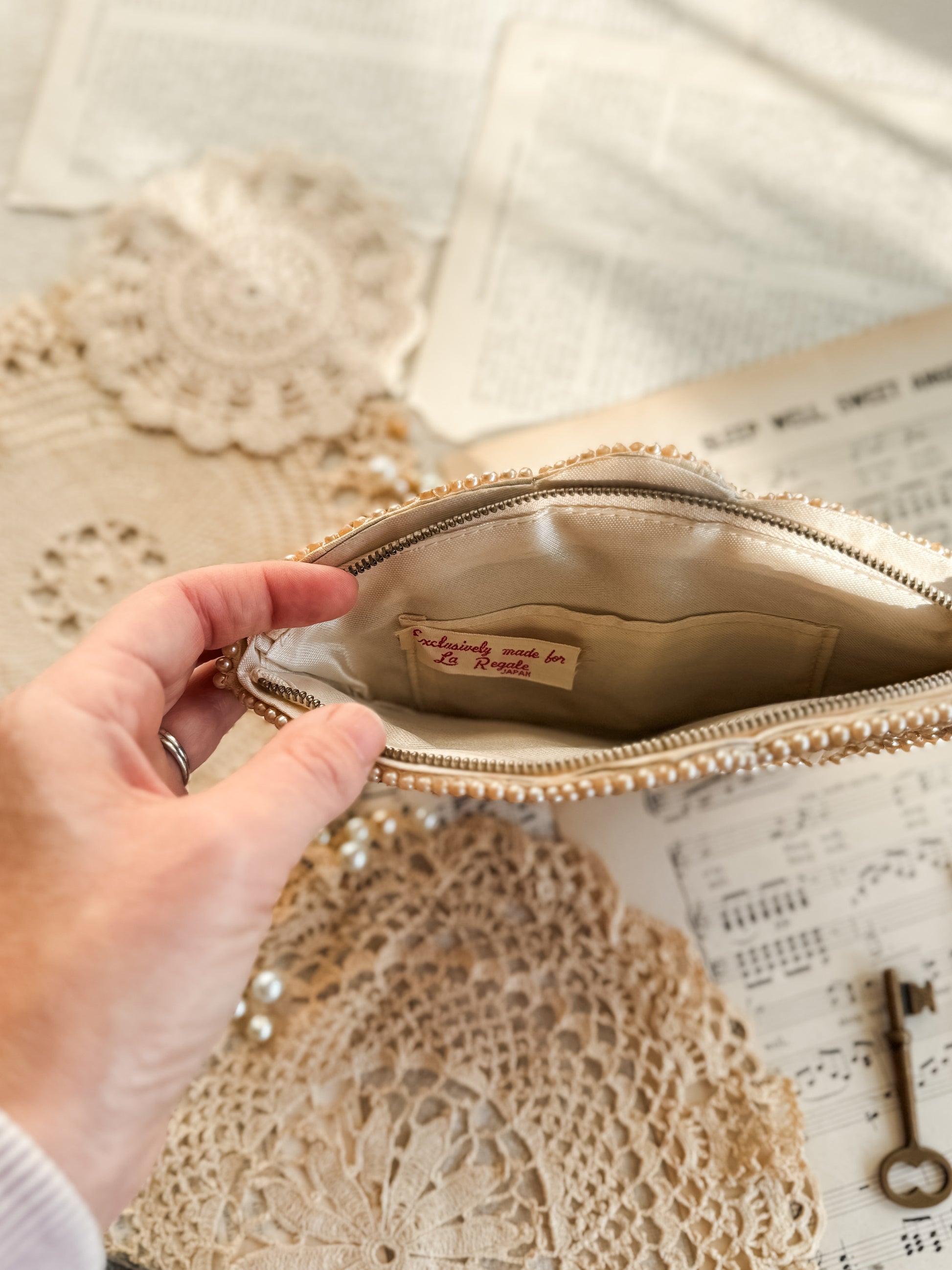 This vintage ivory beaded clutch, crafted by La Regale in Japan during the 1950s, showcases a unique and captivating design. Each side of the clutch features a distinct ivory-on-ivory monochromatic bead pattern, creating a visually appealing contrast.