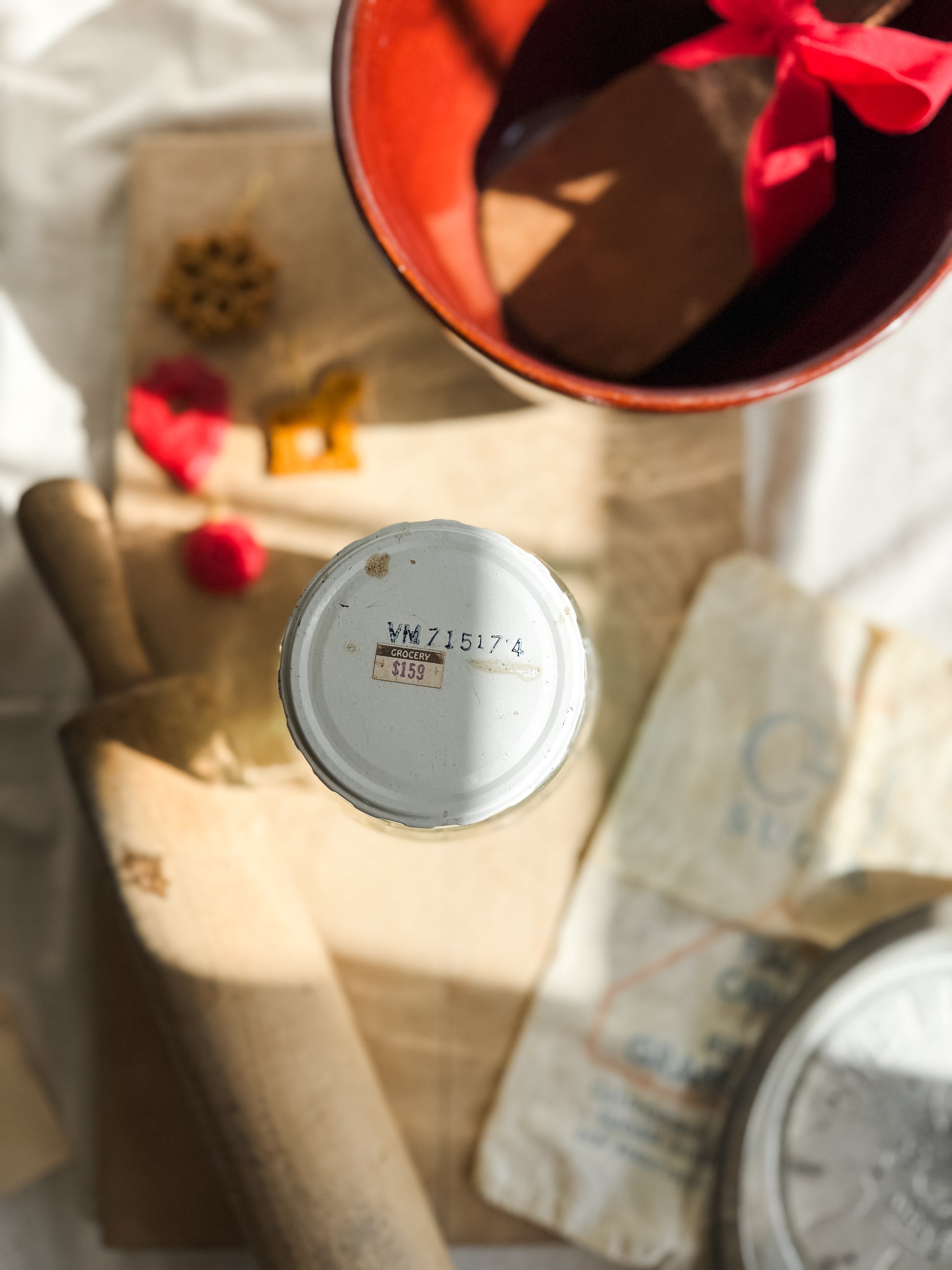 It’s always fun to add a little holiday decor to the kitchen and what better way than a vintage jar filled with vintage ornaments?